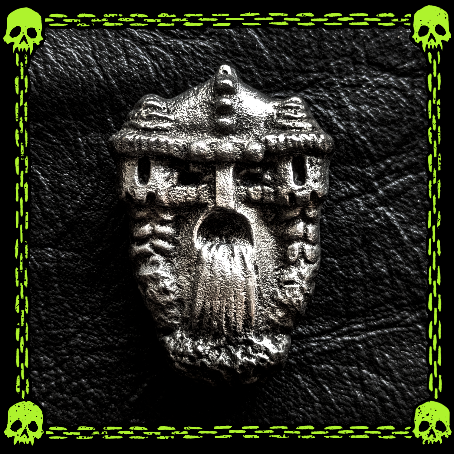 Castle Face heavy metal lapel pin. Sculpted original design by Prilzor, hand cast in pewter. This is a handmade item, each one may differ slightly from this image.