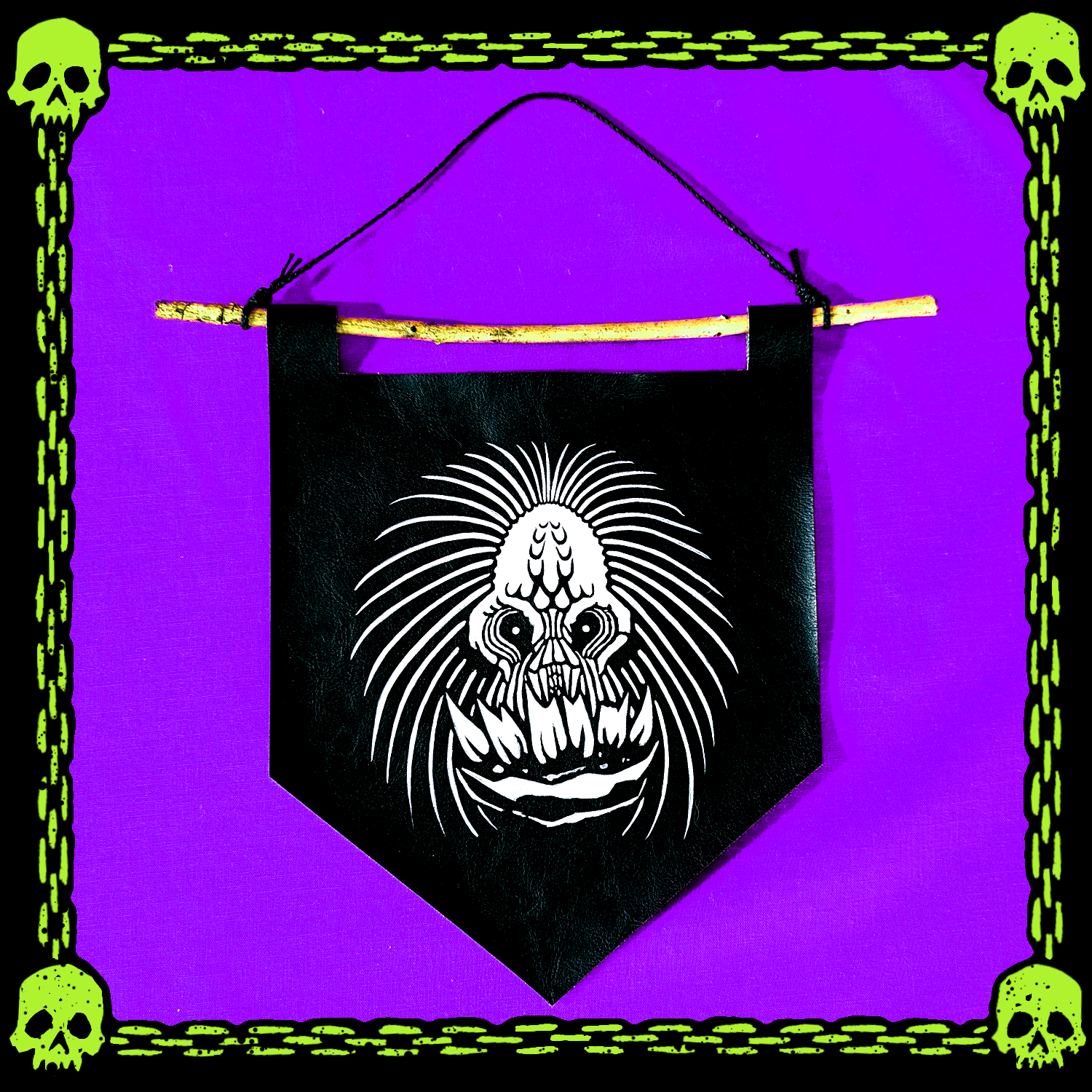 Ghoul Banner on black vinyl - looks like real leather! One of a kind hand painted design. Approx. 9" x 8" banner size. Art by Prilzor